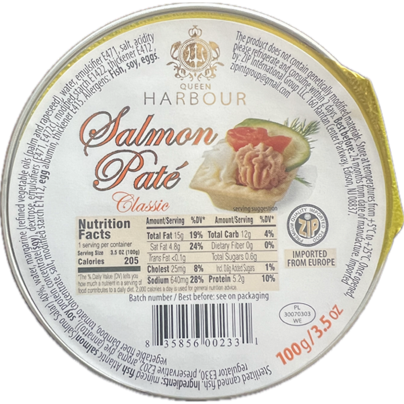 Queen Harbour Salmon Pate with Garlic is a rich and flavorful spread made from high-quality salmon blended with a touch of garlic for a perfectly balanced taste. The smooth, creamy texture makes it easy to spread, while the mild garlic flavor adds depth without overpowering the delicate salmon.