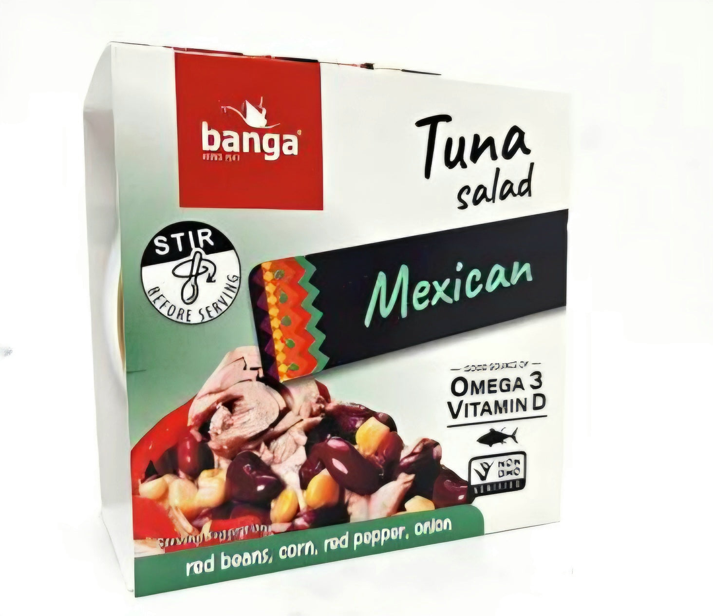 Banga Tuna Salad Mexican Style 180g is a ready-to-eat canned product featuring skipjack tuna mixed with classic Mexican-inspired ingredients like kidney beans, sweetcorn, onions, and red peppers, seasoned with chili, cumin, and garlic for a spicy, flavorful punch, perfect for quick lunches or adding to wraps and salads. It's a convenient, protein-rich meal with a zesty, spicy taste.